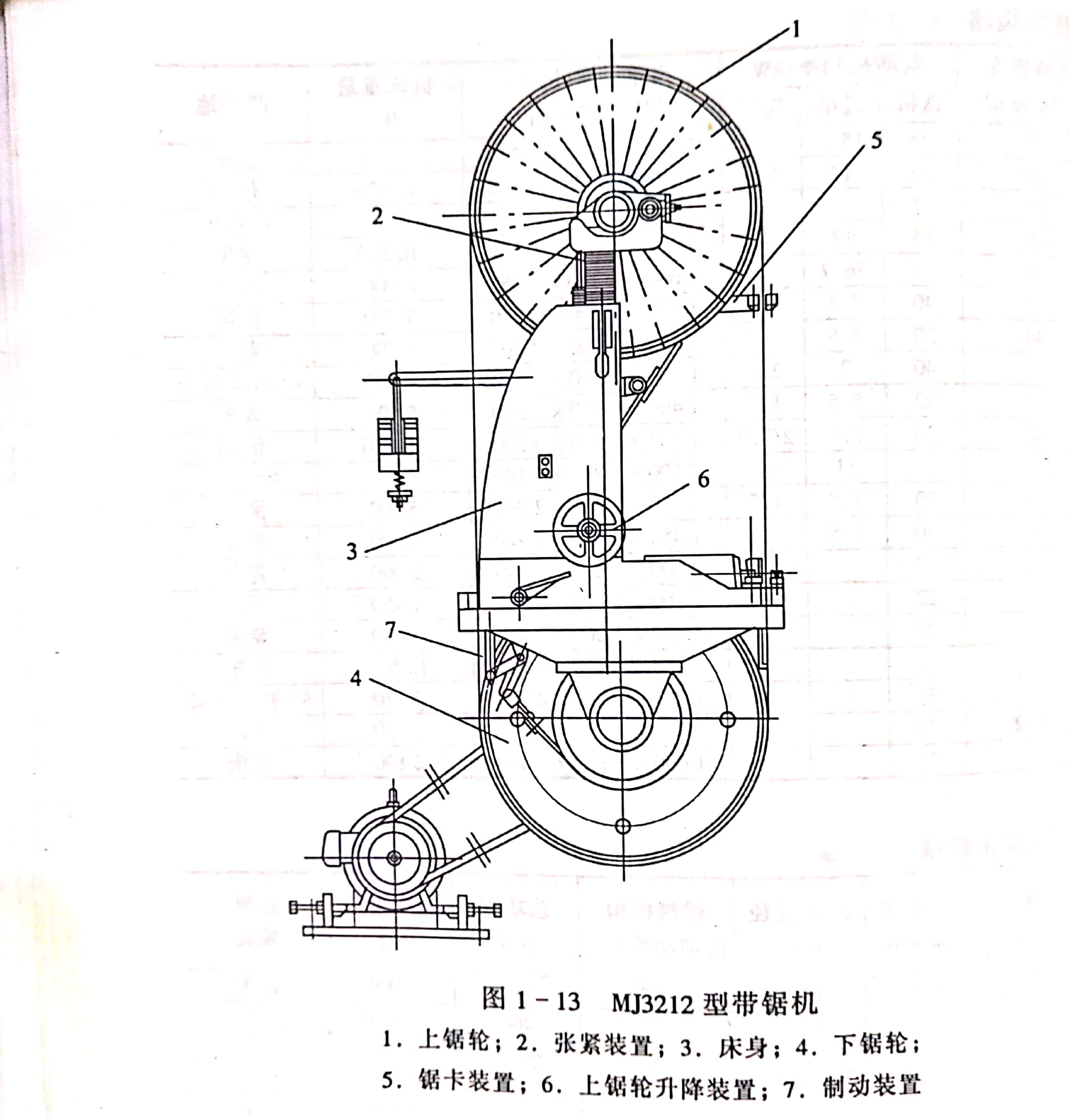 的結構基本相似,都是由床身、上下鋸輪、鋸條張緊裝置、鋸輪升降裝置、鋸卡裝置、傳動裝置以及其他輔助裝置等組成(圖1-13)。各