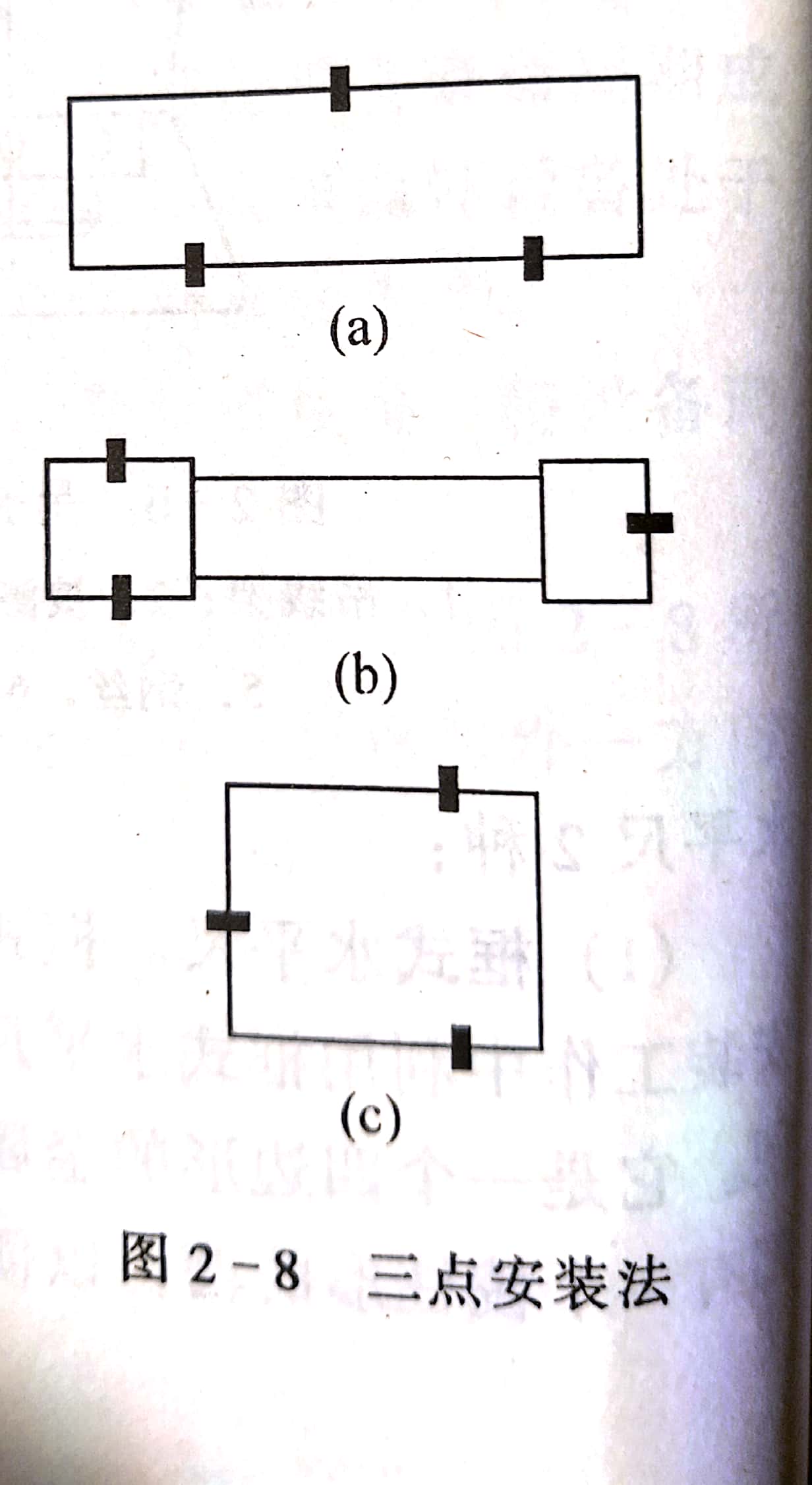 對中小型帶鋸機(jī)的找平方法可用三點(diǎn)安裝法,如圖2-8所示。先利用前兩點(diǎn)找好一個方向水平,然后用一點(diǎn)調(diào)另外一方向的水平,再安裝固定墊板。