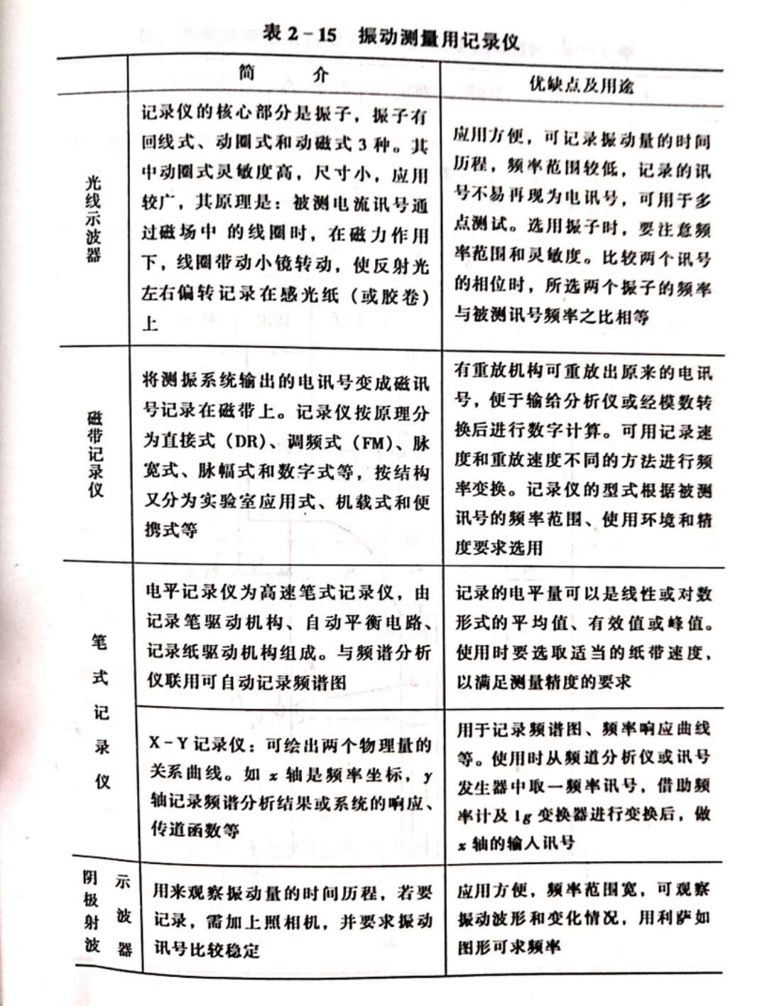 (3)記錄指示器。為了將信號(hào)記錄下來,可將信號(hào)輸?shù)接涗泝x中,用記錄紙、膠卷或感光紙留下記錄,以便存入檔案。常用的記錄指示器有電平記錄儀、光線示波器、磁帶記錄器等,見表2-15。