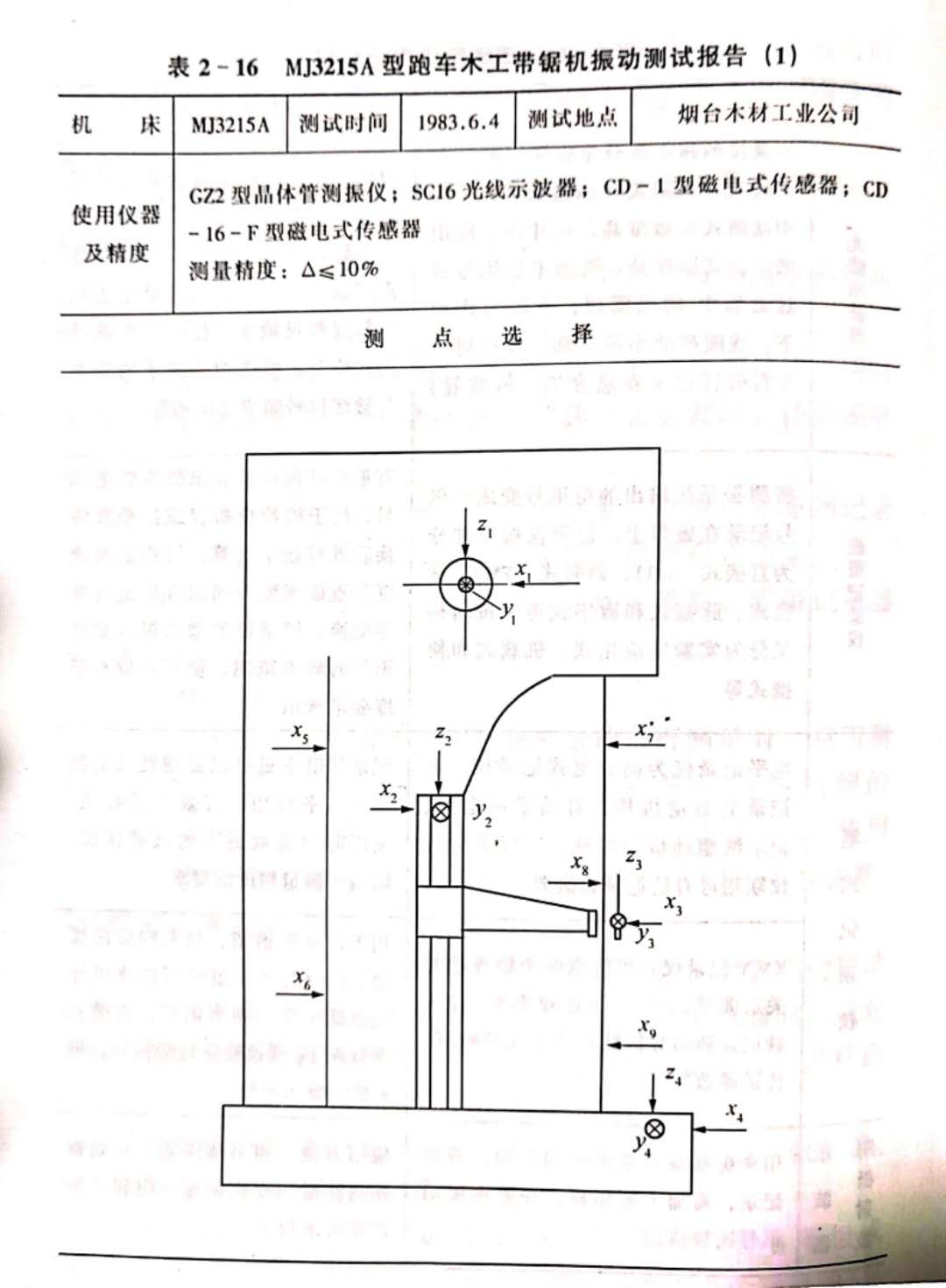 對(duì)工作中或空運(yùn)轉(zhuǎn)中的木工機(jī)床的振動(dòng)進(jìn)行測(cè)量時(shí),只用測(cè)振設(shè)備即可。例如林業(yè)部木工機(jī)械產(chǎn)品質(zhì)量檢測(cè)站檢測(cè)的《M3215A型跑車木工帶據(jù)機(jī)的振動(dòng)測(cè)試報(bào)告》(表2-16)使用了CD-1型、CD-16-F型磁電式傳感器及SC16型光線示波器、G2型晶體管測(cè)振儀等。