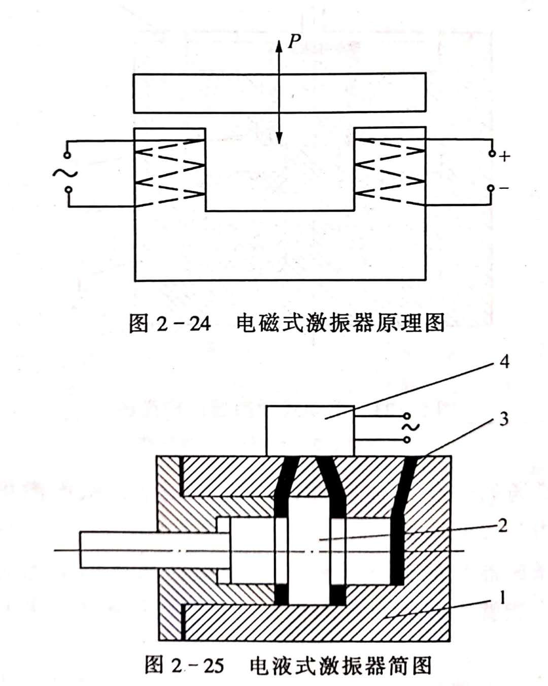圖2-25為電液式激振器的結(jié)構(gòu)簡(jiǎn)圖。1為缸體。電液伺服閥4控制活塞2兩邊油的流向,從而使活塞2振動(dòng)而實(shí)現(xiàn)激振。壓力油3產(chǎn)生預(yù)加靜載荷。電液伺服閥4控制著激振器的頻率范圍。