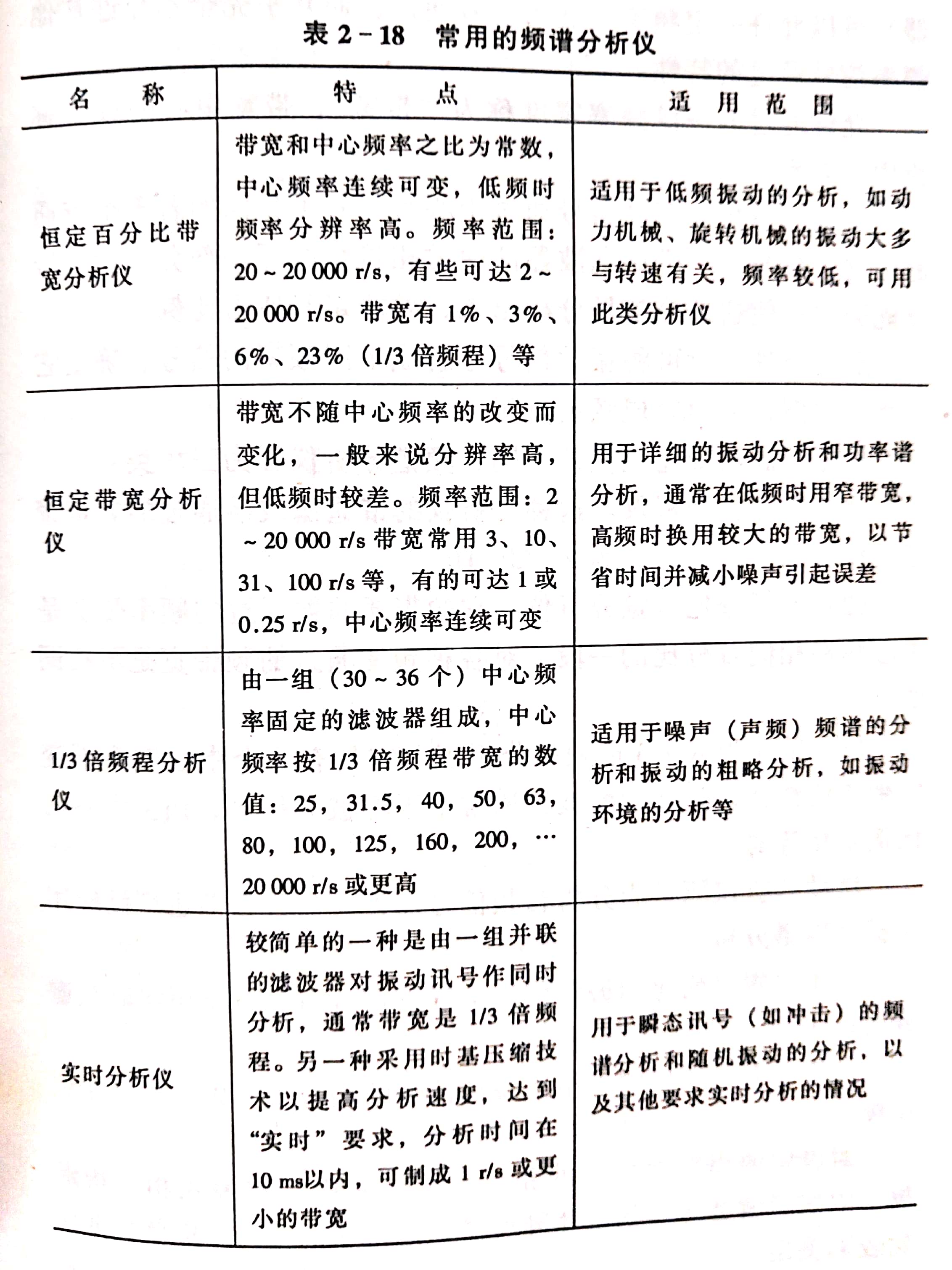 機(jī)床振動(dòng)測試結(jié)果的原始數(shù)據(jù)是用時(shí)間域描述的振動(dòng)器。為了更好地分析研究振動(dòng)特性,還需要知道頻率域的特征,即需要知道信號能量隨頻率變化的函數(shù)關(guān)系。因此,原始數(shù)據(jù)的分析處理,最主要的就是進(jìn)行各種頻譜分析。頻譜分析儀是常用來分析頻譜的設(shè)備。常用的分析儀見表2-18.
