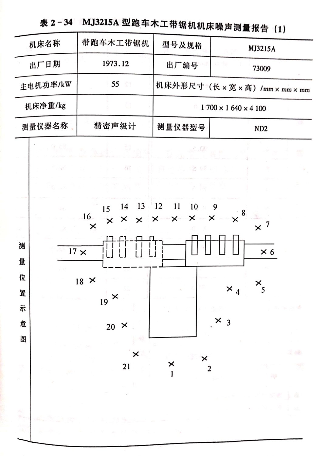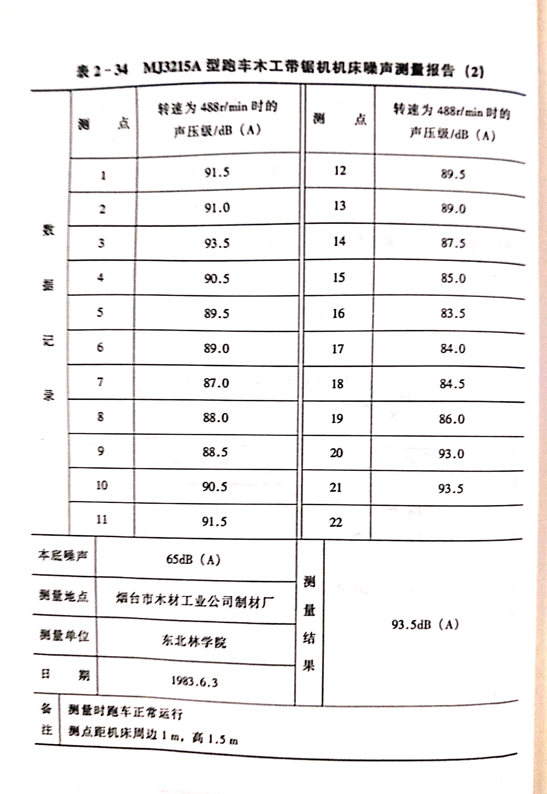 林業(yè)部木工機械產品質量監(jiān)督檢驗站于1983年在煙臺木材工業(yè)公司制材廠現場測定的、瑞福祥木工機械廠生產的《M3215A型跑車木工帶鋸機的噪聲測量報告》如表2-34所示。