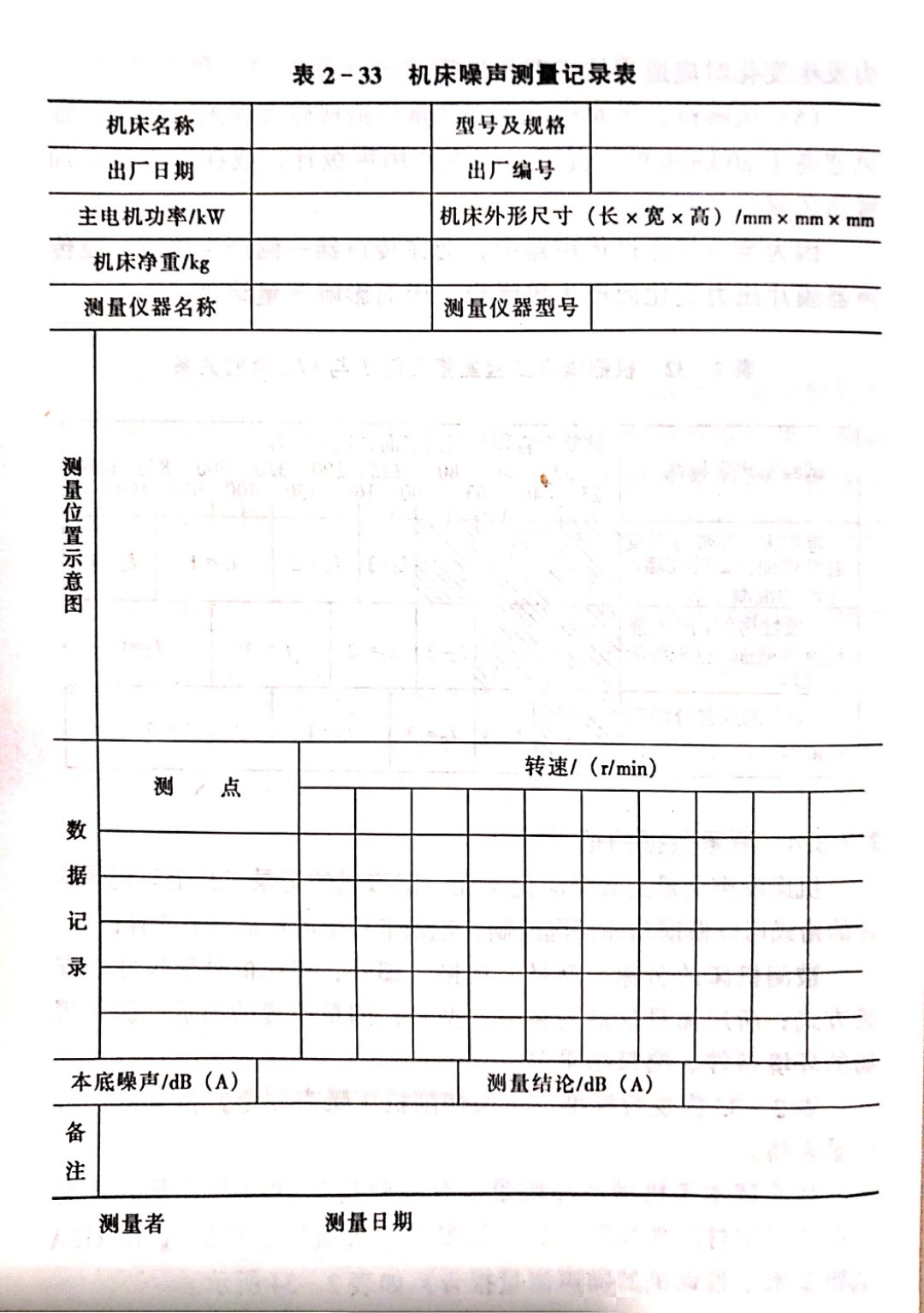 表2-33為現行標準《金屬切削機床噪聲測量》推薦的一種記錄表格。