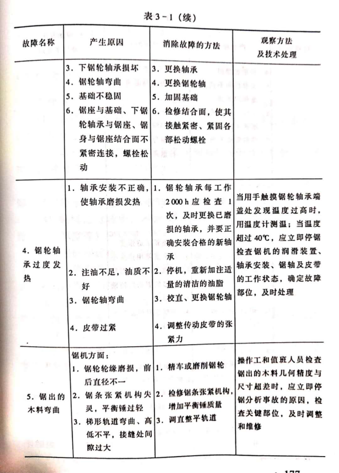 為了保證值班人員能履行技術(shù)監(jiān)督的職責(zé),必須制定值班人員技術(shù)監(jiān)督須知。在須知中,規(guī)定值班人員的義務(wù)和職權(quán),規(guī)定交接班時(shí)間和順序,規(guī)定設(shè)備小修的時(shí)間和順序。在須知中,還要列入鋸機(jī)安全技術(shù)細(xì)則和勞動(dòng)保護(hù)細(xì)則。帶鋸機(jī)的故障產(chǎn)生原因及其消除方法列入表3-1。