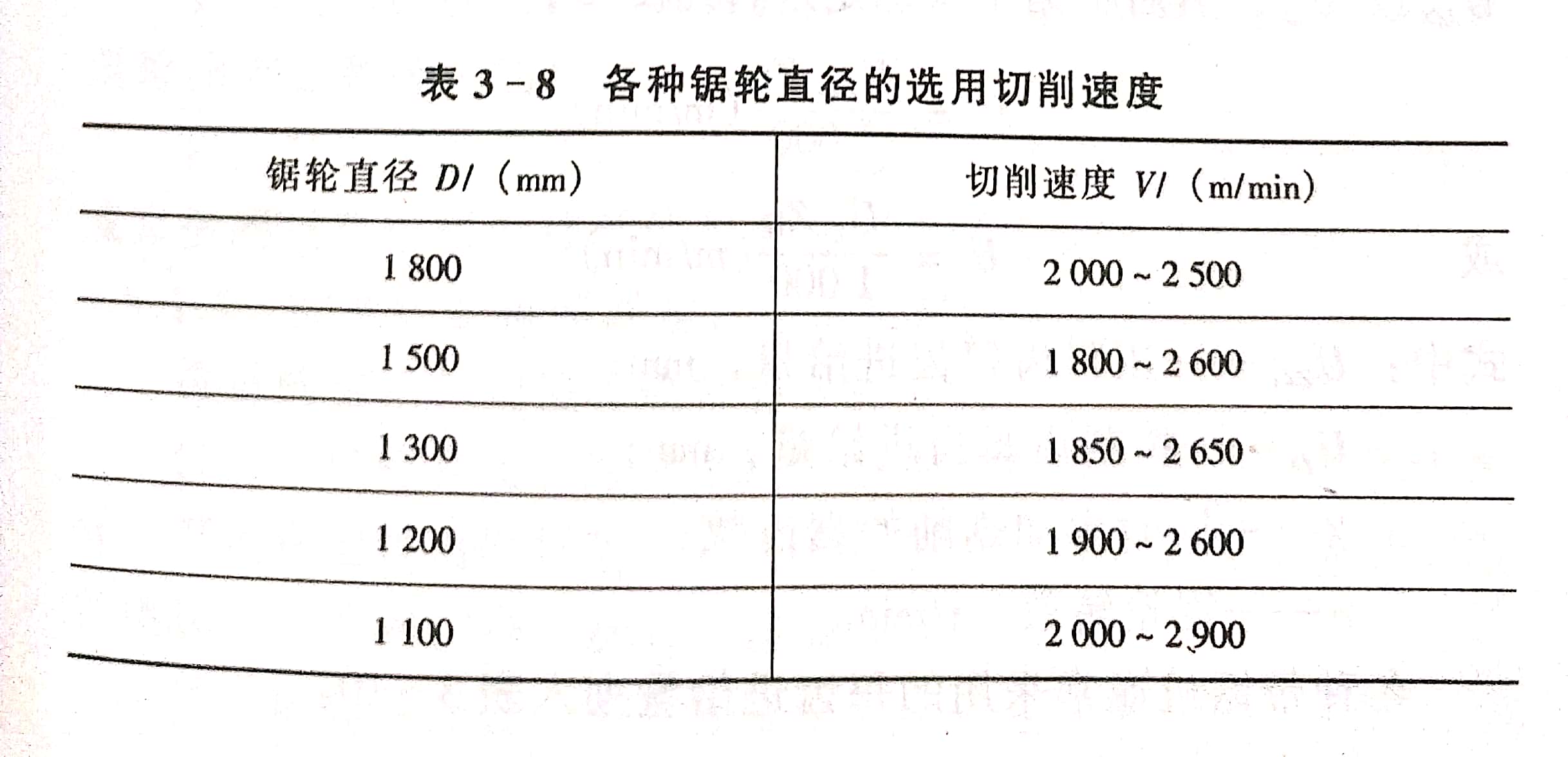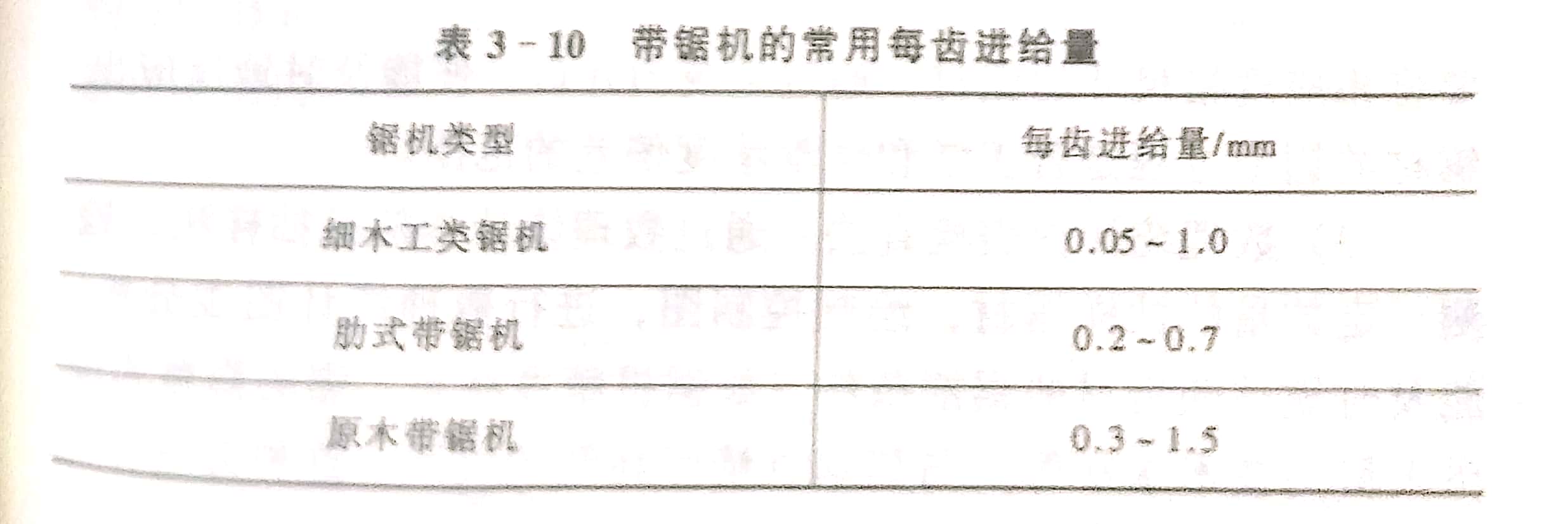 各種帶鋸機通常采用的每齒進給量列入表3-10。