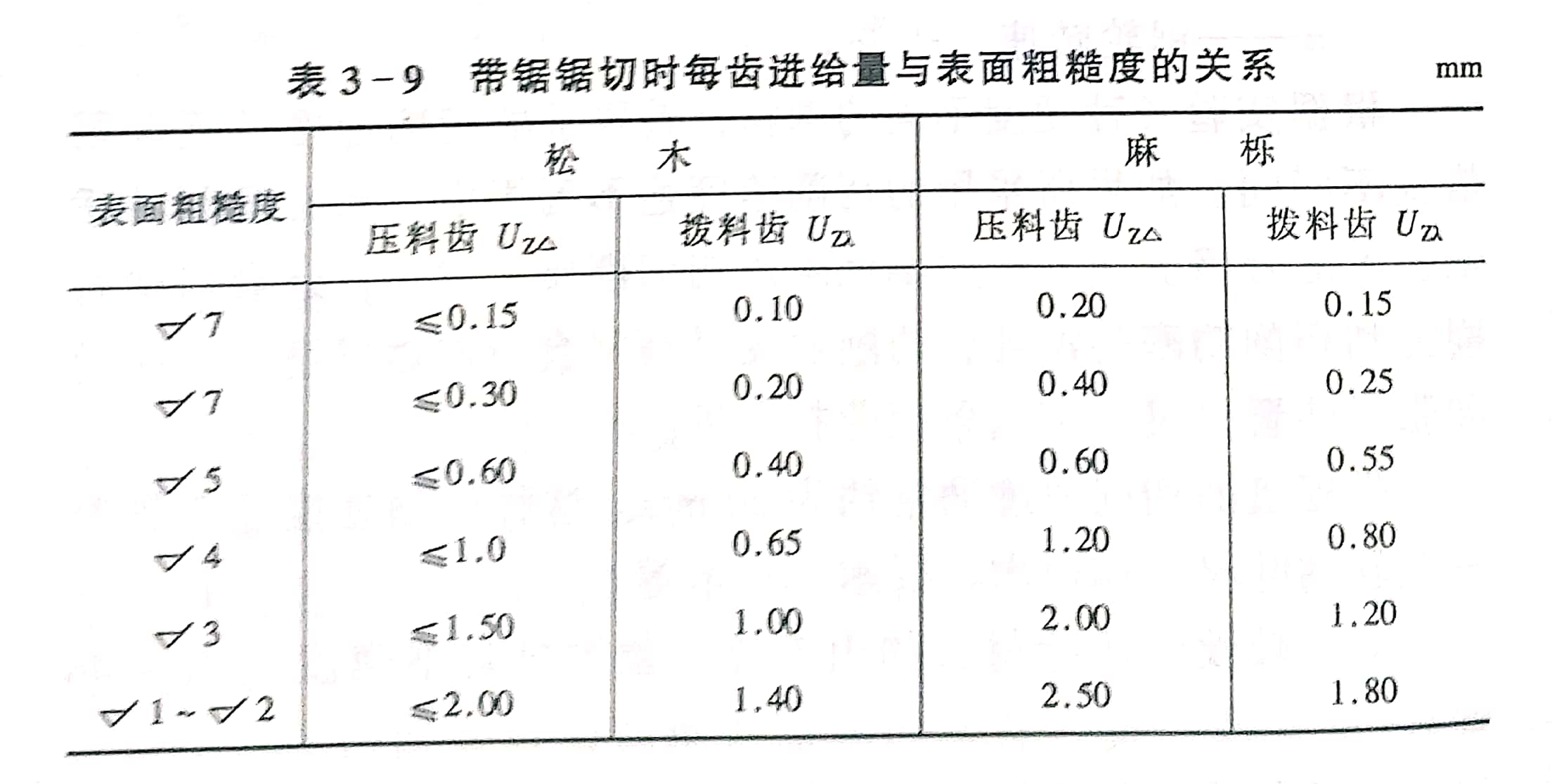 進料速度的高低直接影響鋸割質量,進料速度主要表現在每齒的最大和最小切削量兩個方面。每齒進給量愈小,鋸切質量愈高,表3-9列出帶鋸鋸切時每齒進給量與表面粗糙度之間的關系。