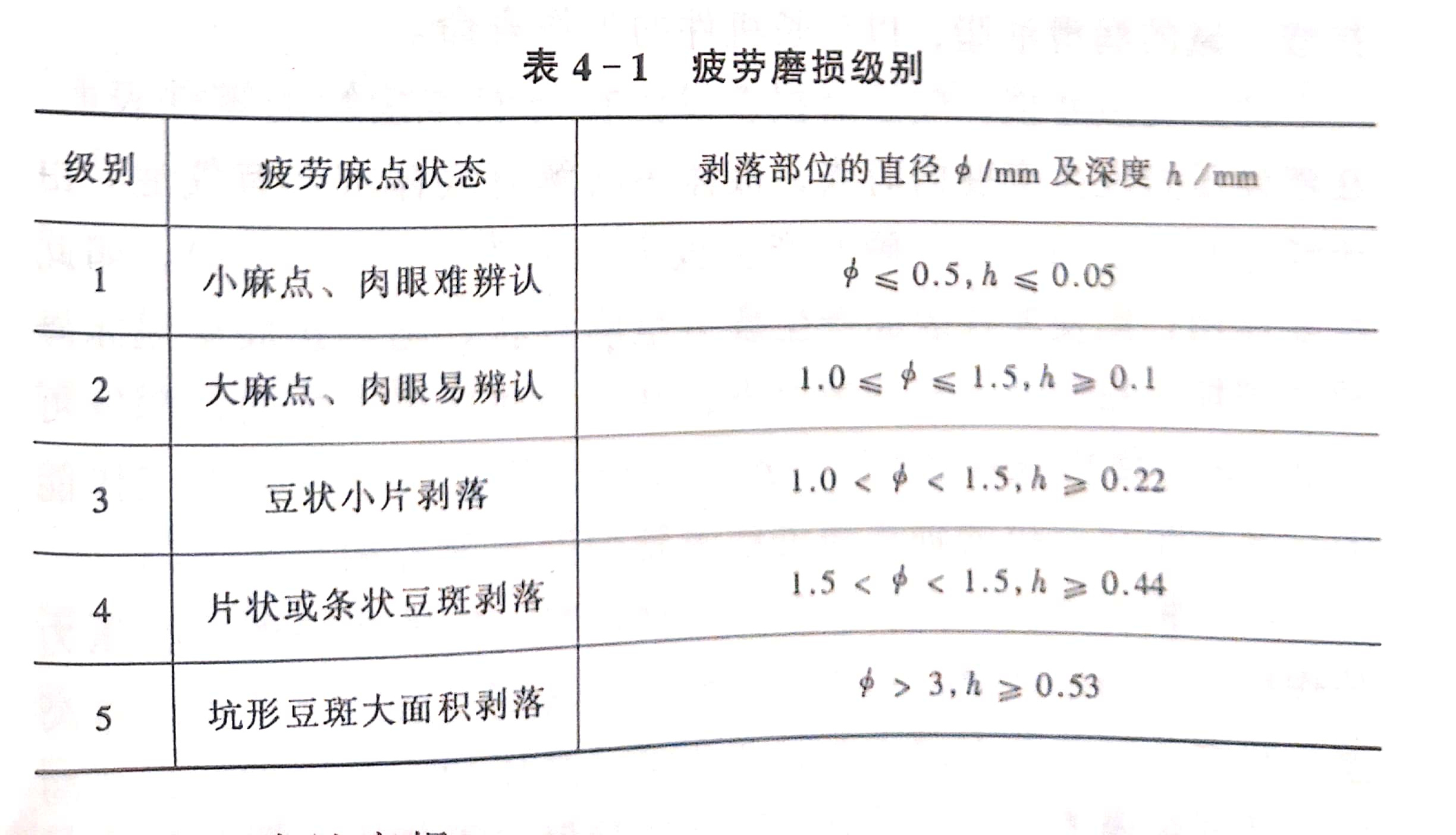 疲勞磨損的程度,可以分為5個(gè)級(jí)別,見(jiàn)表4-1。