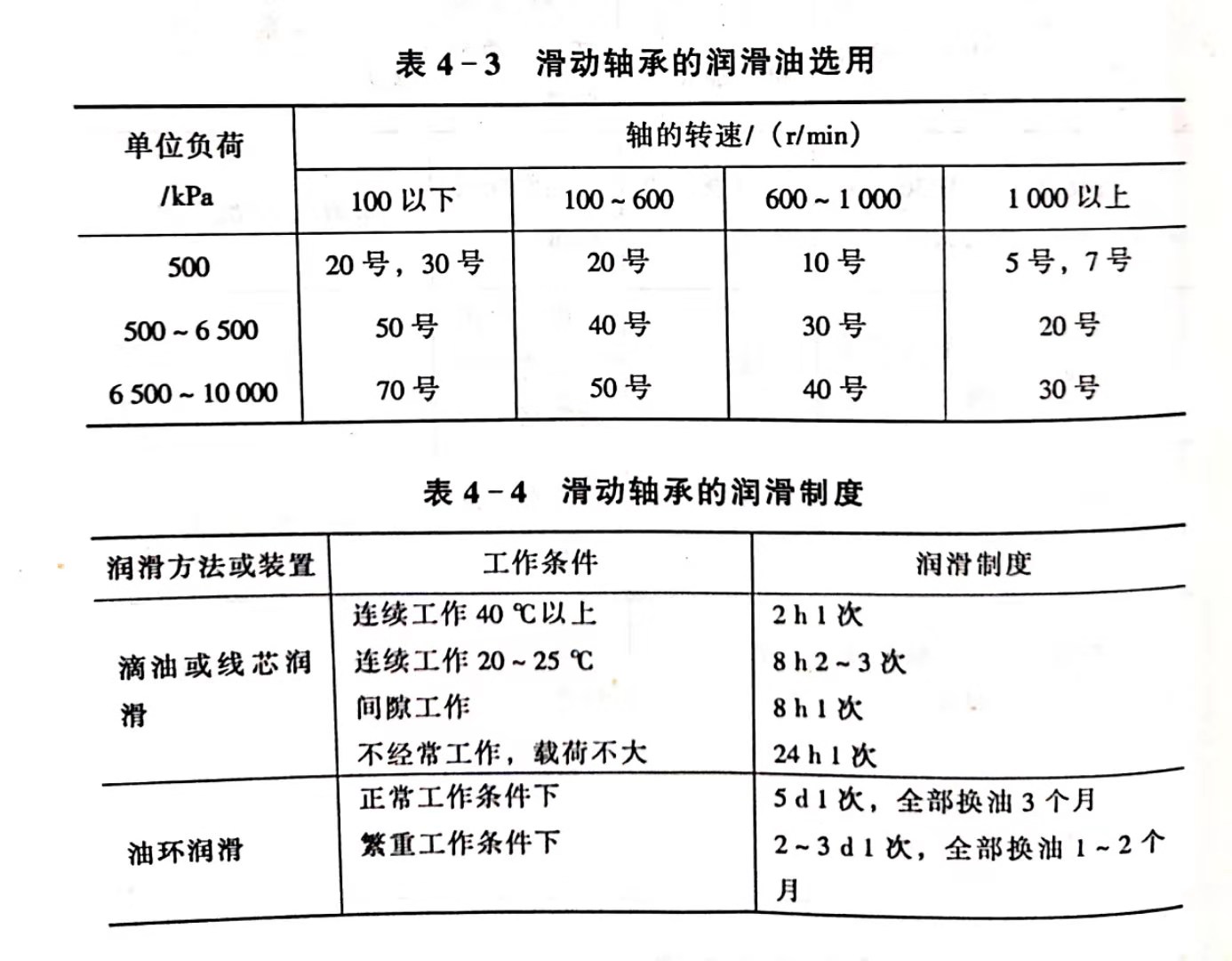 ④負(fù)荷愈大潤滑油的粘度也應(yīng)愈大。負(fù)荷愈小潤滑油的粘度也應(yīng)愈小?;瑒虞S承的潤滑油選用及其潤滑制度見表4-3、表4-4.