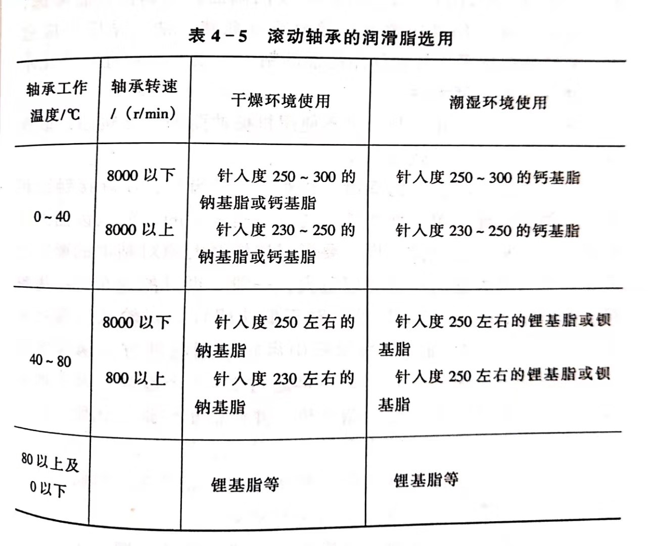 ②鋸機(jī)大多數(shù)滾動軸承都采用潤滑脂潤滑,選用時(shí)應(yīng)考慮轉(zhuǎn)速、負(fù)荷、工作溫度及工作環(huán)境等。工作溫度不高于70℃,在潮濕環(huán)境中工作的軸承可選用耐水性較好的鈣基脂;一般溫度(30~90℃)下工作的滾動軸承。低速采用鈉基或鈣鈉基脂;中速采用鈣基脂,但工作溫度不得超過70℃;高速采用鋰基脂或主軸脂;在極低溫(-50~70℃)下工作的滾動軸承采用特殊雙脂。各種滾動軸承潤滑脂的選用可參考表4-5。
